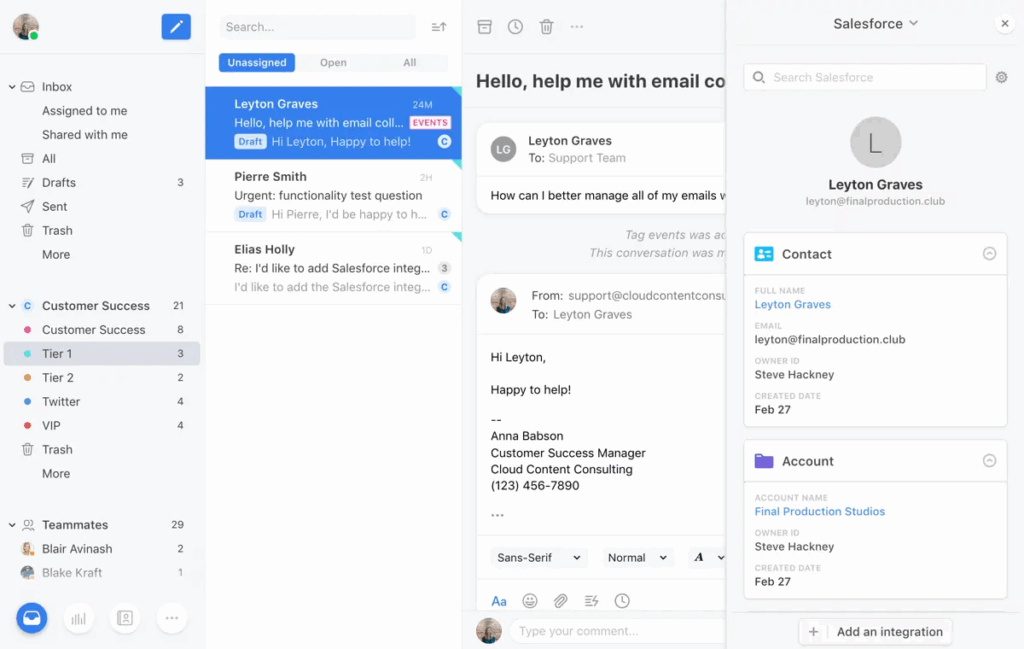 Front CRM, gelişmiş ticket yönetimi özellikleri sunarak kullanıcıların müşteri taleplerini birden fazla iletişim kanalında merkezileştirmesine, önceliklendirmesine ve atamasına olanak tanır. Platform, süreçleri kolaylaştırmak için paylaşılan gelen kutuları, dahili yorumlar ve iş akışı otomasyon araçları ile işbirliği ve ekip çalışmasını vurgular.