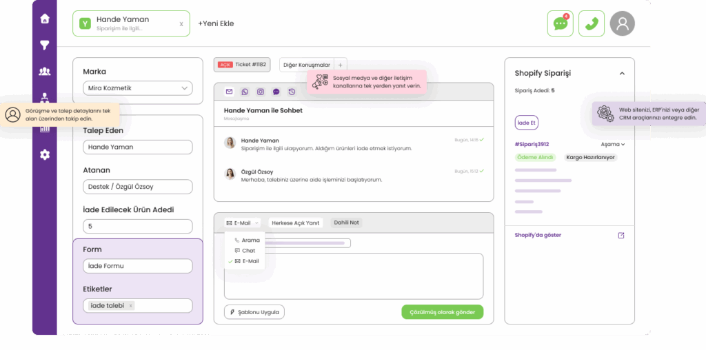 Çok kanallı destek, satış otomasyonu ve yapay zeka gücünü tek bir platformda birleştirin. Operasyonel verimliliği artırarak müşteri sadakatini güçlendirin ve ölçülebilir sonuçları hemen görmeye başlayın!